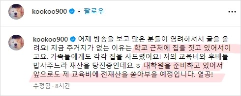 어제 방송을 보고 많은 분들이 염려하셔서 글을 올려요! 지금 주거지가 없는 이유는 학교 근처에 집을 짓고 있어서이고요 가족들에게도 각각 집을 사드렸어요! 저의 교육비와 후배들 밥사주느라 재산을 탕진중인데요ㅎ 대학원을 준비하고 있어서 앞으로도 제 교육비에 전재산을 쏟아부을 예정입니다. 열공!