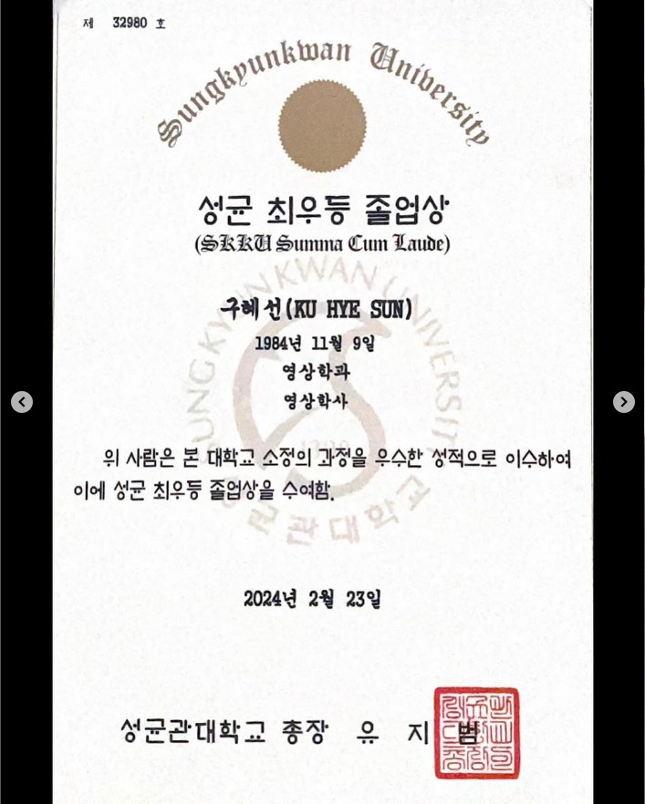 해당 영상은 작년 12월에 촬영된 영상분으로, 현재 구혜선씨는 성균관대 영상학과를 최우수성적으로 졸업하여 대학원에 다니고 있다고 합니다. 실제로 최우등졸업상을 증명하면서 본인의 학업성적을 증명했죠. 구혜선씨는 참 다재다능한 것 같습니다.