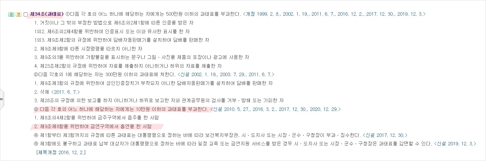 기안84가 흡연에 대하여 과태료 처분을 받은 근거는 국민건강증진법 제34조(과태료) 제3항 제2호입니다. 우리는 이 법이 뭔지 당연히 모르겠죠~? 저는 이 법을 자세히 찾아봤어요. 이미지가 잘 안 보인다면 법령사이트 버튼을 눌러서 34조를 검색해보세요!!