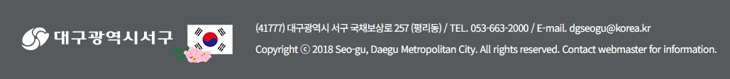 대구광역시 서구청은 대구광역시 서구 지역의 행정과 공공 서비스를 담당하는 기관으로, 주민들에게 다양한 생활 편의를 제공합니다. 서구청은 지역 사회의 발전과 주민들의 복지를 위해 다양한 정책과 프로그램을 운영하며, 지역 경제 활성화와 환경 보호를 위한 노력을 기울이고 있습니다. 서구청 홈페이지에서는 민원 처리, 공지사항, 시정 소식 등을 간편하게 확인할 수 있으며, 주민들의 편의를 위해 온라인 서비스를 통해 다양한 행정 업무를 신속하게 처리할 수 있도록 지원하고 있습니다.