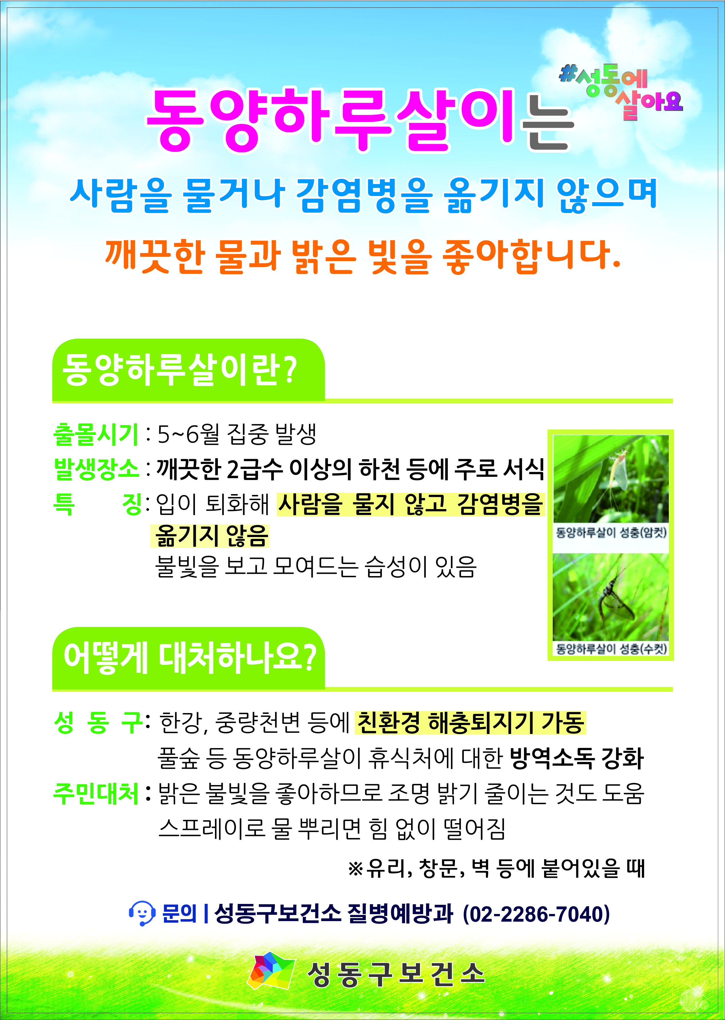 서울시 성동구 보건소는 하루살이에 대한 정보를 배포하고 대처법을 공개했습니다. 읽어보면 별 다른 대처법은 없고 친환경 해충퇴치기 가동, 방역소독 강화 등의 원론적인 이야기밖에 없습니다. 스프레이로 물이 뿌리면 힘 없이 떨어진다는데 숫자가 너무 많죠~?