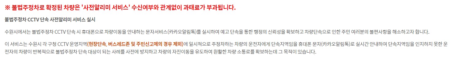 서비스는 수원시 각 구청 CCTV 운영지역에서 제공되며, 현장 단속, 버스레드존 및 주민신고제의 경우에는 제외됩니다. 수기단속구간(횡단보도, 곡각지, 인도, 그 외 수기단속이 필요하다고 인정되는 지역)에서는 서비스가 제한될 수 있습니다.