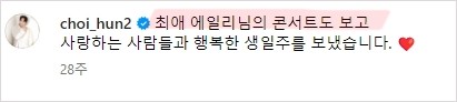 이 소식이 알려진 후, 최시훈이 지난해 자신의 생일 주간에 에일리의 콘서트를 방문한 사실이 다시 주목받았습니다. 최시훈은 당시 자신의 인스타그램에 "최애 에일리님의 콘서트도 보고, 사랑하는 사람들과 행복한 생일주를 보냈습니다"라는 글을 남겼습니다.
