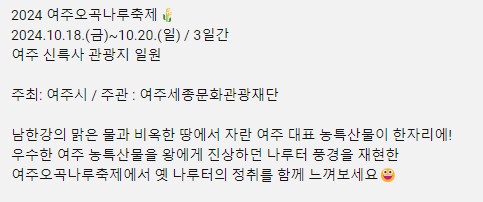 여주오곡나루축제는 여주의 풍요로운 농경문화를 기념하며, 전통과 현대를 잇는 중요한 축제입니다. 이 축제는 농업의 중요성을 알리고, 다양한 체험 프로그램을 통해 방문객들에게 여주의 전통과 문화를 깊이 이해할 수 있는 기회를 제공합니다.