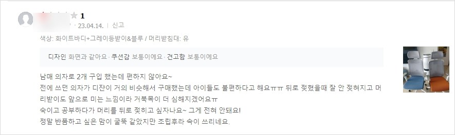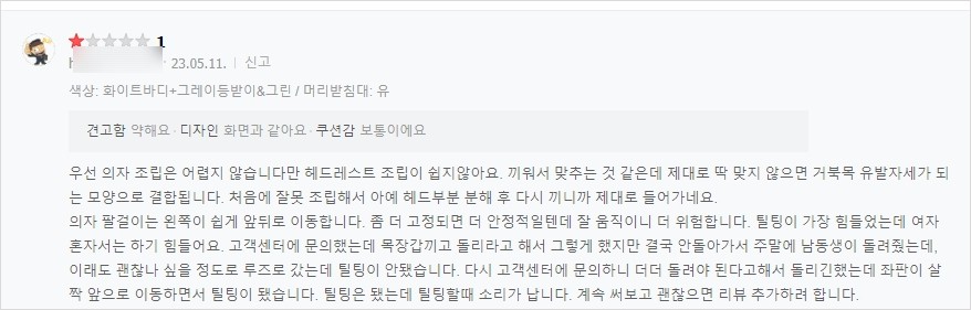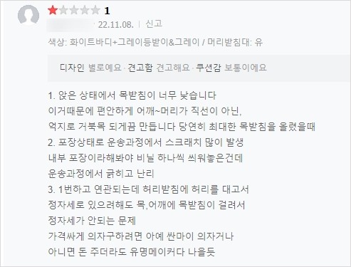 - 머리 받침대가 너무 튀어나와 있어서 거북목이 생길 것 같다.