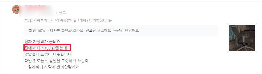 - 금액대비 만족이다. T50 air와 앉았을 때 느낌이 비슷하다.