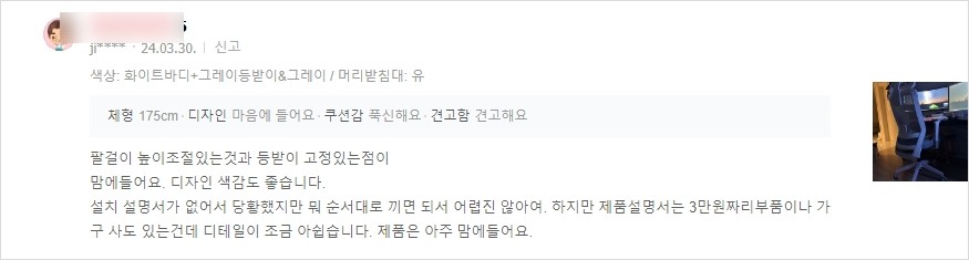 - 팔걸이 높이 조절 부분이 좋았고 디자인이 이쁘다.
