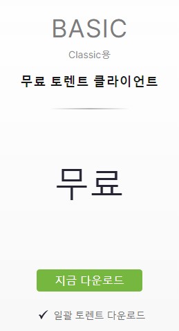 유토렌트 한글판은 공식사이트에서 다운로드 할 수 있습니다. 무료 버전과 유료 버전이 있는데 유료를 사용할 필요 없이 무료만 사용하시면 되고요, Classic Ver 다운받아서 사용하시면 됩니다. 굳이 유료 사용하지 마세요. 설치 과정에서 다른거 설치하니 뭐니 하는것도 설치하지 마시고 딱 유토렌트 한글판만 설치하시면 됩니다.