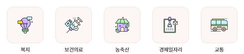 | 민원 처리 | 농업 지원 서비스 | 환경 보호 정책 |