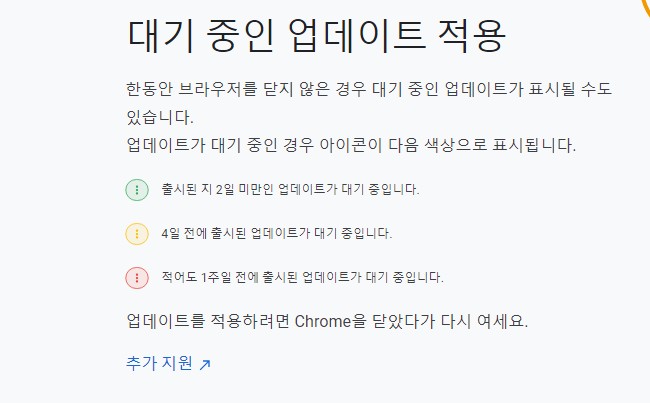 위와 같은 방식으로 업데이트를 할 수 있습니다. 방법 자체는 쉽죠? 단, 업데이트를 한 다음 반드시 주의해야 할 것이 있는데 업데이트가 잘 되었는지 작동을 확인해야 한다는 것입니다. 업데이트가 잘못되면 브라우저가 오작동할 수 있습니다.