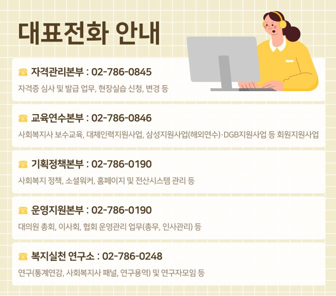 - 한국사회복지사협회 운영지원본부 : 02-786-0190