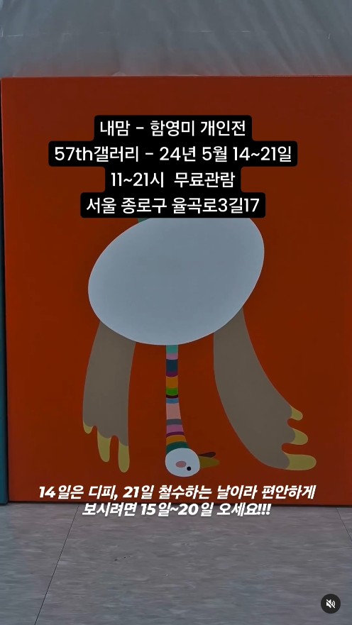 장소는 서울 종로구에 위치한 57th Gallery이며 가격은 무료입니다. 함영미 인스타그램에 따르면 14일은 전시회 준비하는 날, 21일은 철수하는 날이라고 하니 편하게 보려면 15~20일에 방문하면 된다고 합니다. DP와 철수를 도와주실 분들은 15일, 21일에 가도 좋겠네요 😎😎