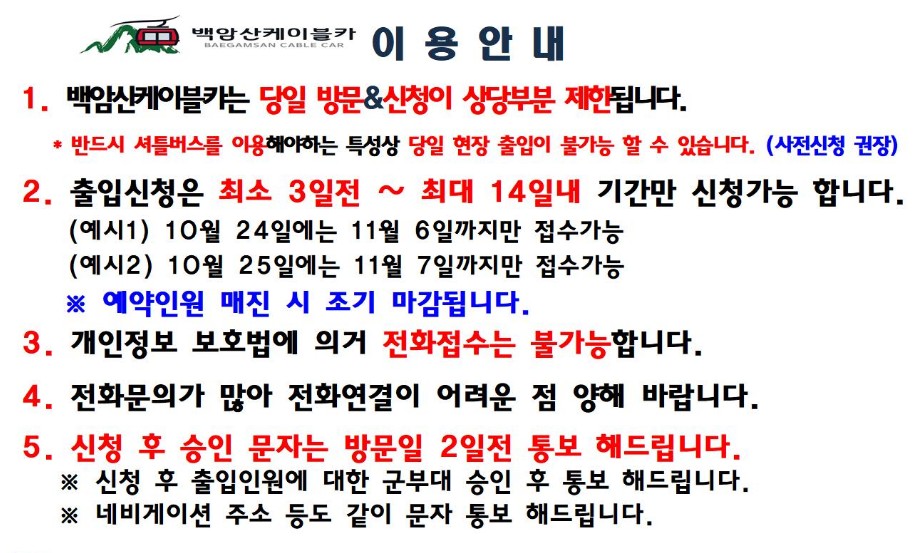 백암산 케이블카를 예약하기 전에 우선 유의사항을 봐야 합니다. 유의사항을 보면 '백암산케이블카는 당일방문, 신청이 상당부분 제한(불가능)하며 반드시 셔틀버스를 이용해야 하는 특성상 당일 현장 출입이 불가능 할 수 있다.' 라고 되어 있습니다. 즉, 예약은 선택이 아닌 필수라는 점이죠.